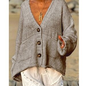 Plus Khaki Solid Knit Button Down Pockets Loose Fit Cardigan