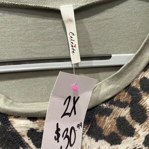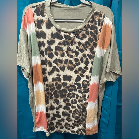 Leopard and tie dye design on shirt sleeve sage colored top.
