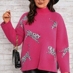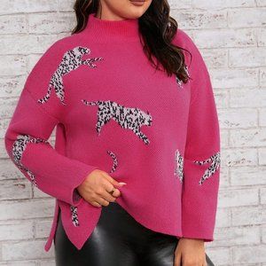 Plus Leopard Pattern Mock Neck Split Hem Sweater pink