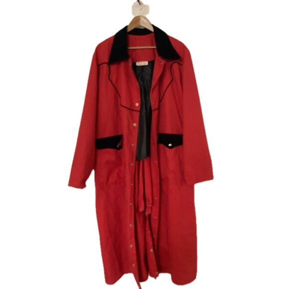 Like new, floor length coat with saddle gap in back, red heavy cotton with black corduroy trim