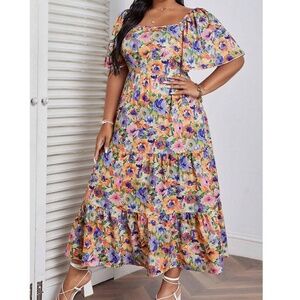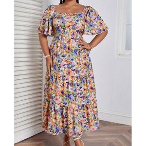 Plus Multicolor Floral Print Butterfly Sleeve Tie Back Maxi Dress
