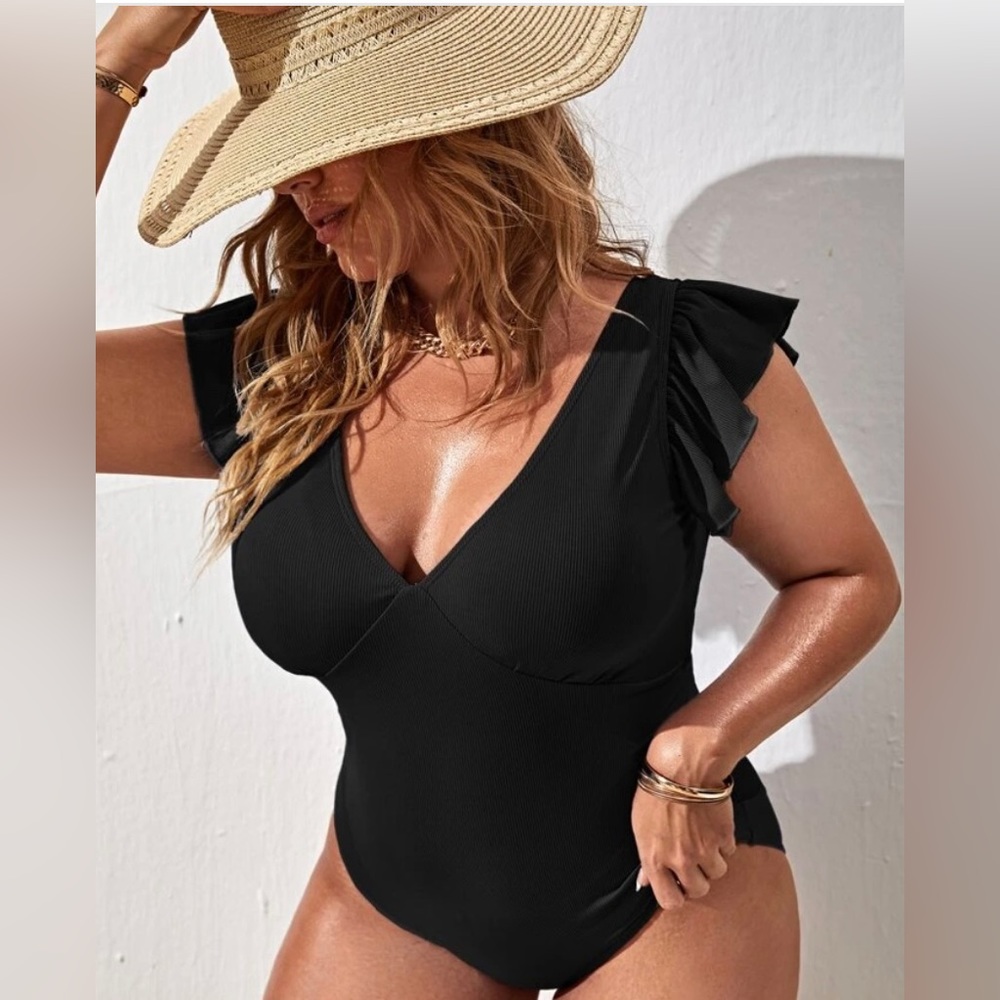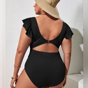 Plus Rib Ruffle Trim One Piece Swimsuit in black with open back, detachable clasp