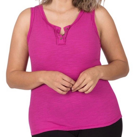 Plus Ribbed Henley Tank Top in Barbiecore pink featuring soft stretchy material. New in packaging, never worn. Boutique brand. Available in Womens Size 1X-3X, other colors available in seperate listing.