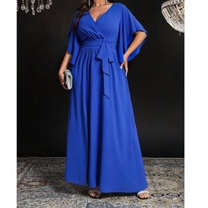 Plus Royal Blue Butterfly Sleeve Belted Split Hem Maxi Dress
