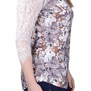 Silky gray and brown flowered top with white lace upper chest, back and arm length sleeves. There is room for stretch in the upper body. Very cute with some denim capri's for spring/summer.