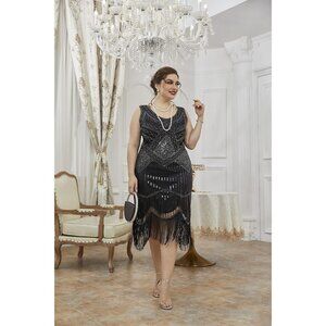 Plus Size 1920s Vintage Fringed Gatsby Sequin Beaded Tassels Hem Flapper Dress f