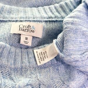 Description — Cozy and festive, this Croft & Barrow cable-knit sweater brings wintry charm to your wardrobe. The soft, icy-blue hue and textured front cables feel perfect for December nights, holiday photos, and casual gatherings.