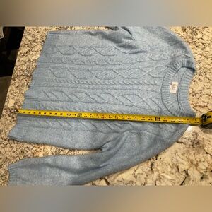 Features: crew neckline • plush cable-knit front with smooth knit sleeves/back • ribbed collar, cuffs, and hem for a snug finish • long sleeves • soft acrylic/nylon blend (per tag: 60% acrylic, 40% nylon).