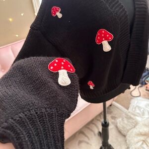 Looking for a unique piece to add to your closet? Well, you found it. This knit cardigan from Forever 21 is the perfect piece for fall. It is black with long sleeves. It has red and white mushroom detailing on the front. The sleeves are slightly larger for a cute, retro look.