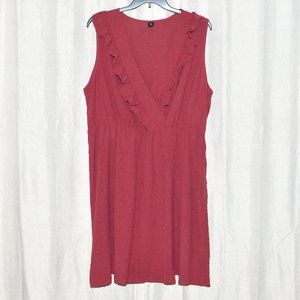 Lovely brick red, rusty fall color! Dobby texture on the lightweight outer shell. Ruffles front and back. High waist with elastic band to snatch the waist. Fabric is breezy. Unlined. Surplice style chest will show off plenty of cleavage. (It does not lay "closed" nearly as high up as on the model in stock photo.) Sleeveless, tank style.
