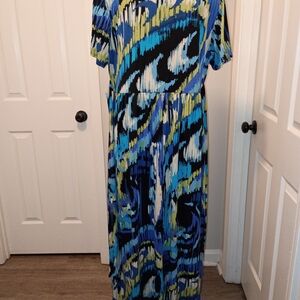 AGB PLUS SIZE DRESS Elevate your style with this stunning blue abstract print maxi dress. Has Attached straps To tie around waist Perfect for any occasion, this dress offers a blend of comfort and elegance.