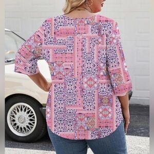 Elevate your style with this vibrant pink and purple patterned top. Perfect for any occasion, this top offers both comfort and elegance.