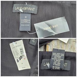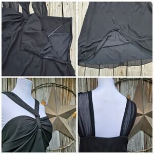 Lightweight flowy semi sheer georgette fabric in solid black w/ crinkle texture. Sweetheart neckline w/ twist front halter style in front & wide sheer straps in back. Side zip, fully lined. Dress has roman goddess romantic vibes w/ lots of draping, flutter & flounce. Preowned, never worn: tags still attached. Issues noted in photos. Good preowned condition, overall. Plus Size 28 by Lane Bryant.