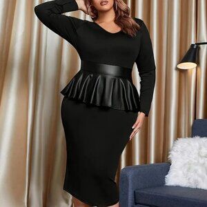 Elevate your wardrobe with this stunning plus-size black dress, perfect for both office and party occasions. Featuring a flattering V-neck and long sleeves, this elegant bodycon midi dress is adorned with stylish ruffles that add a touch of femininity. Designed for comfort and sophistication, it's an ideal choice for spring and autumn.