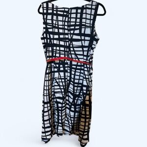 Elevate your style with this chic black and cream patterned dress, featuring a faux patent leather red belt. Perfect for brunch or a cocktail event.