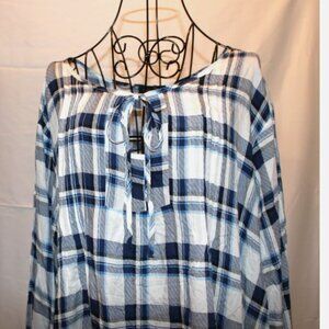 Plus Size Blouse 4X Plaid Rayon Pullover Top Drawstring Neck Tunic NWT White