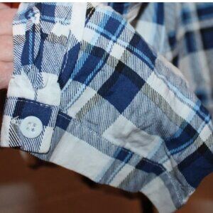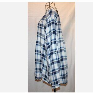 Suzanne Betro rayon pullover top with convertible button-up sleeves. White plaid with blue and black and drawstring tie neckline. Size 4X, bust is 54", length is 27", sleeve length is 24". New with tag.
