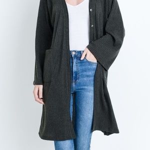 Boxy rib knit sweater cardigan with button front with 2 front patch pockets