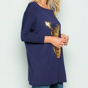 Nwot boutique plus size navy blue long sleeve tunic with gold sequin deer patch.