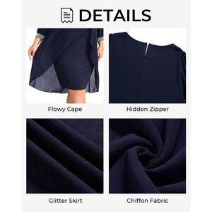 Features: Elegant knee-length dress with a flowy chiffon cape that adds a touch of drama and sophistication. The fitted silhouette enhances curves, while the stretchy polyester skirt with glitter offers comfort and a bit of sparkle. Pull-on style makes it easy to wear for any special occasion.