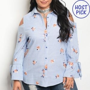 Plus size long ruffle sleeve pin striped top with a collar neckline and floral details.