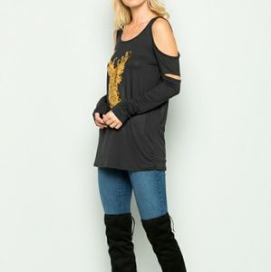 Nwot boutique plus size black long sleeve cold shoulder cutout sleeve top with gold sequin deer patch. Sizes 1x 2x 3x.