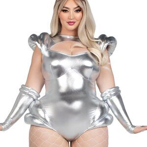 You'll be a super-nova sensation in the 2 PC Cosmic Cutie costume. This sexy plus size Halloween costume includes a curve-hugging metallic bodysuit with padded details and fingerless gloves.