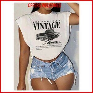 Plus Size Crop Tee Vintage Car Graphic Short Sleeve Crew Neck Casual