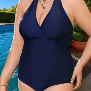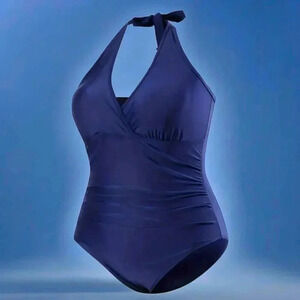 🆕 Plus Size Curvy Halter One Piece Swimsuit Navy Blue 0XL Moderate Stretch