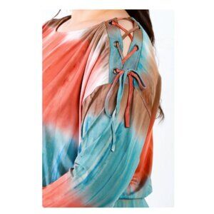 tie-dye print, lace up shoulder details, dropped shoulders, long sleeves, round neckline, elasticized waistline, slim fit, back button loop closure, back wrap cut-out details, stretchy, unlined, non-sheer, stylish, trendy, street style, streetwear