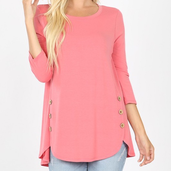 Plus Size Dusty Pink Lightweight Scoop Neck with Dolphin Hem and Accent Buttons Stretchy Top Blouse Tunic