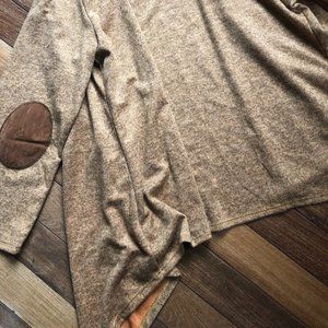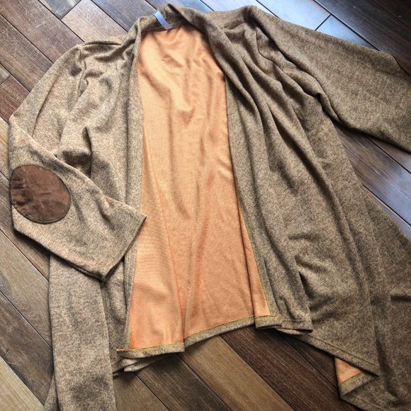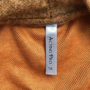 Acting Pro Elbow Pad Cardigan. Size 1X. Tan with muted orange inner lining. Longer on the sides. Great condition and thick for Fall/Winter. 95% Polyester, 5% Spandex. Cleaned, sanitized and ready to go!
