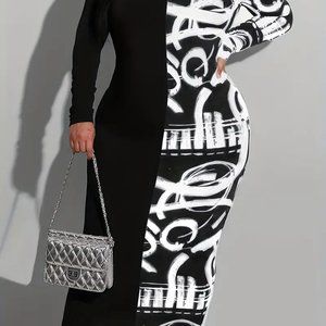 Plus Size Elegant Dress, Women's Plus Color block Graffiti Print Off Shoulder Long Sleeve Medium Stretch Maxi Midi Dress