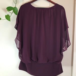 Style & co. Plus Size Flutter-Sleeve Banded-Hem Top. The blouse is 25" across armpit to armpit 29" long. 100% polyester. The lining is 100% polyester. The bottom is 95% polyester 5% Spandex. Sugarplum colored. Host Pick 5/17/2017