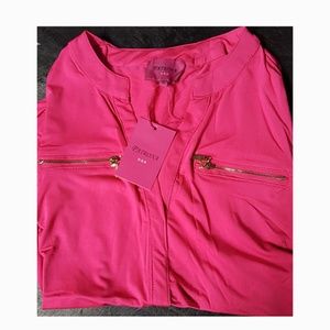 Plus size soft and comfy sleeveless fuchsia top, w/gold zipper front pockets. Perfect for office hours and after hours pair with any type of bottom it look and feels great. A classic update to your closet. Model is wearing 2XL 95% Polyester 5% Spandex made in USA. Also available in black or white 33-17