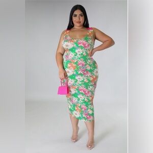 Plus Size Green Floral Cut Out Self Tie Back Closure Midi Dress