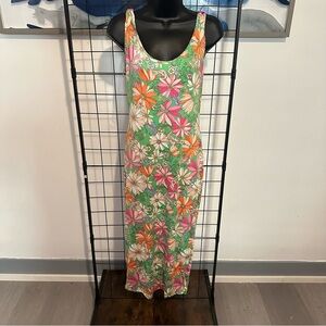 Green floral Stretch dress, Round neckline, Sleeveless, X back, Back cutout, Ribbed, Self tie closure.