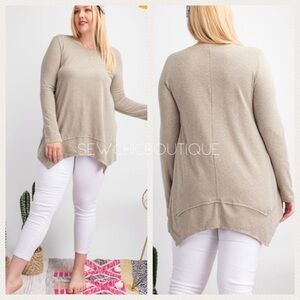 Pretty Green Tea color in a soft long sleeve Slub Tunic in Plus Size with raw unfinished seams, a relaxed fit silhouette & finished with the pointy uneven shark bite hem. The color is more like a pale olive green. The Tunic has a crew neck & is a soft poly cotton knit. It’s lightweight & not sheer in any way.