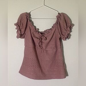 Plus Size Mauve Eyelet Lace Ruched Top with Puff Sleeves, 1X