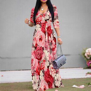 Features: Flowy floor-length maxi with a flattering V neck, stylish 3/4 sleeves, and a belted waist to accentuate your curves. Soft, stretchy, and breathable fabric makes it perfect for any season, whether you're attending a fall wedding or a casual outing.