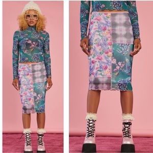 Multi print Patchwork midi skirt with mesh overlay and scalloped trim along the waistline and ruffle hemline
