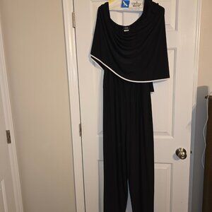 A poncho overlay falls from the off-the-shoulder neckline for added coverage in this striking plus size jumpsuit from MSK.