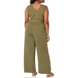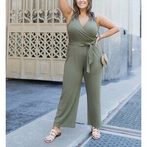 Plus Size Olive Green Sleeveless Wide-Leg Jumpsuit With Waist Tie