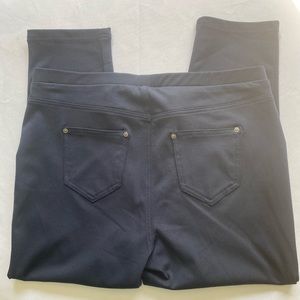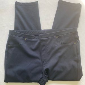 NWOT navy blue pull up stretchy pant. Faux pockets in front. Real back pockets. Elastic waistband. Straight leg. 52% polyester 43% cotton 5% spandex