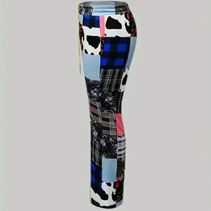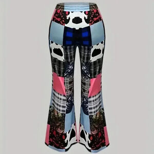 Plus Size Pants, Women's Plus Patchwork Print Elastic Drawstring High Rise Medium Stretch Flared Leg Trousers