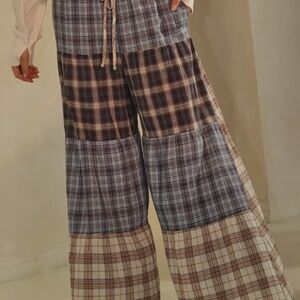 Relaxed patchwork pants featuring a mix of plaid panels and a drawstring waist for a cozy, vintage-inspired look. These cute pants have pockets and wide flowing legs.