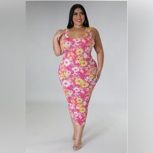 Plus Size Pink Floral Cut Out Self Tie Back Closure Midi Dress