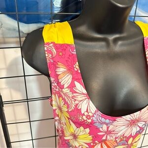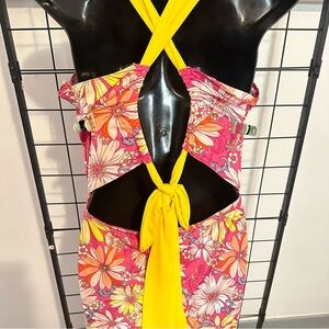 Pink floral Stretch dress, Round neckline, Sleeveless, X back, Back cutout, Ribbed, Self tie closure.