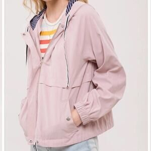 Who doesn’t love a good hooded jacket?! 💗 This lightweight jacket is a great piece to keep on hand for transitional weather when it’s not too hot or cold. Comes in a pretty blush pink with a striped navy contrast hood. A zip front with side pockets, adjustable drawstring hood and waist all come together to create a causal utility feel that's neither overdone nor bulky.