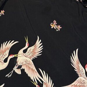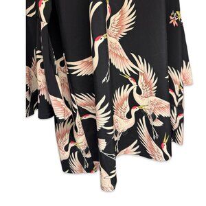 Plus Size Retro Crane Print Dress with Bell Sleeves. 70's Inspired Black Pull Over Mini Dress with a high neck and long flowy sleeves with a beautiful creme, brown, and red bird print through out the dress. Size 0XL. By Shein Curve. 100% Polyester. Dress has no stretch. Approx Measurements while laying flat "pit to pit" - 21" neck opening width - 9.5" total length of dress from center back to bottom hem - 36" length from bottom of armpit to bottom hem - 29" Dress is pre-loved and in great condition and all signs of wear can be seen in the photos. Check out my other items to bundle and save! I welcome reasonable offers : ) #retrodress #plussize #weddingattire #partyfits #officewear
